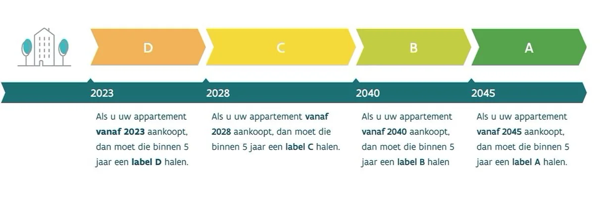 Label A is het einddoel voor iedere woning of appartement tegen 2050. Het langetermijnpad werd vastgelegd met verstrengingen in 2028, 2035, 2040 en 2045.