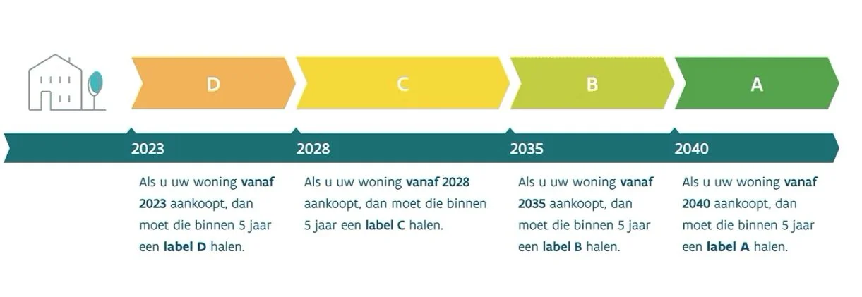 Stel dat u in 2023 een woning koopt met label F. U bent verplicht om deze te renoveren tot label D binnen de vijf jaar (2028). Als u de woning (met label D) opnieuw verkoopt in 2030, dan zal de nieuwe eigenaar opnieuw moeten renoveren, nu tot minstens label C of beter.